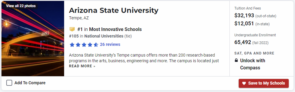 作为一所世界级的公立研究大学, ASU在美国最有创新能力的大学中排名第一,9年来排名第一,领先于哈佛、麻省理工学院、斯坦福。美国的亚利桑那州立大学在其它方面的成绩也很好,例如:世界综合排名105,顶尖公立大学第51位,本科生教育13位,商业分析学科9位,尽管 ASU的综合排名并不高。但是,亚利桑那凯瑞商学院和富顿工程学院都是一个很好的选择,他们的供应链管理专业在全美都是数一数二的。
