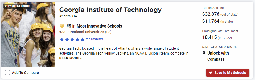 佐治亚理工学院是美国三大科技大学之一,它与麻省理工和加州理工学院齐名。土木工程,工业工程(25年),网络安全,这些都是美国最好的。将近20个学科在美国排名前三。
