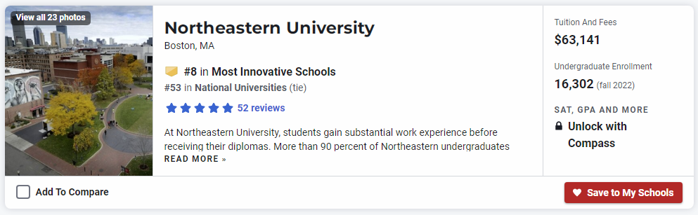 东北大学大学由8个学院组成,设有175个本科专业和227个研究生专业,东北大学有多于35个研究和教育中心。汇聚了来自全世界122个国家的精英,在实践性学习、跨学科研究以及社区参与方面都处于世界领先地位。在以往以及现在的教员中,有数位获得古根海姆基金和一位国际天才发明奖获得者,一位美国总统的民主党候选人和一位普利策奖获得者。