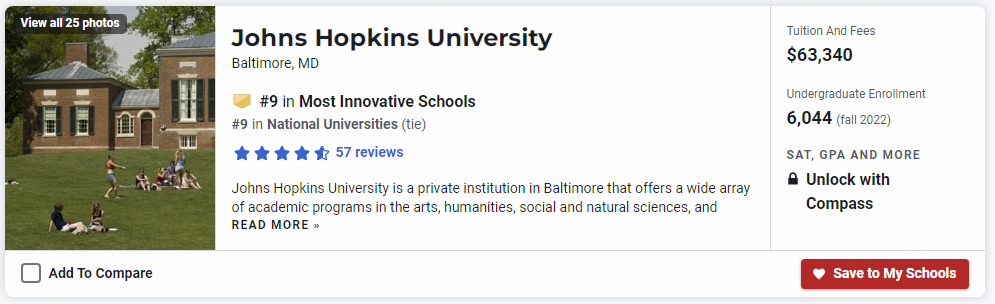 约翰斯·霍普金斯大学(JohnsHopkinsUniversity,简称Hopkins或JHU)创立于1876年,是私立综合研究型大学,位于美国马里兰州巴尔的摩市,美国第一所研究型大学,也是北美学术联盟美国大学协会(AAU)的14所创始校之一。美国国家科学基金会连续33年将该校列为全美科研经费开支最高的大学。学校的教员与职工共有37人获得过诺贝尔奖。