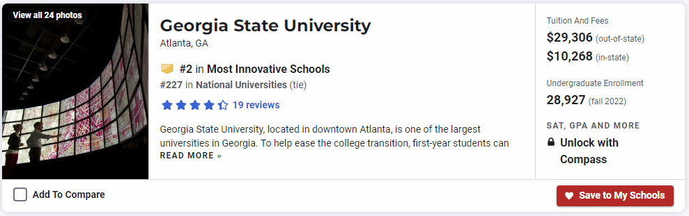 美国东南部的佐治亚国立大学,是全美最顶尖的研究型大学,学生满意度高,学费合理,就业率高,在《福布斯》杂志的评选中,在乔治亚州名列第二。