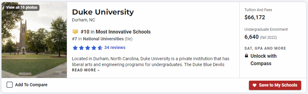 杜克大学是一所享有盛名的私立、研究型大学,始建于1838年。杜克大学在美国的社会与高等教育体系中占有举足轻重的位置,它在全球范围内享有很高的声誉,同时也是美国南部地区的顶尖学府。杜克大学是世界高等研究院联合会的会员,也是美国高校联合会的会员。